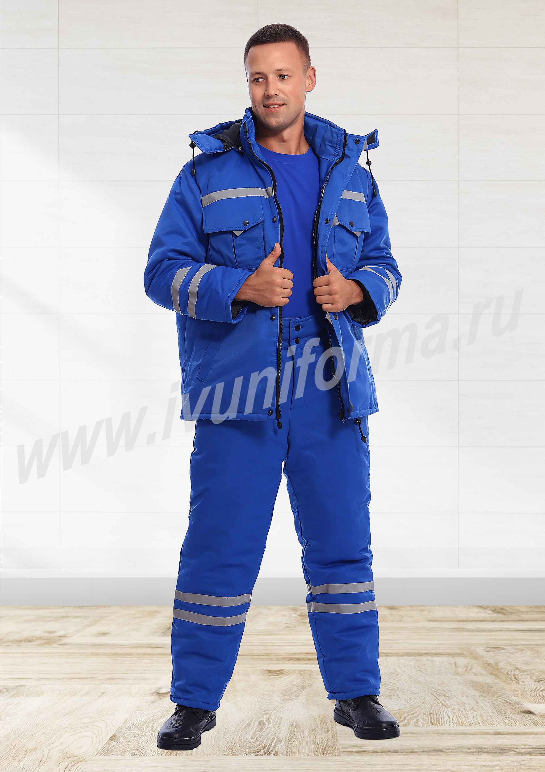 Костюм мужской для скорой помощи состоит из куртки и брюк. Куртка средней длины с воротником стойкой, с центральной застежкой на молнию и ветрозащитной планкой на кнопки. Для регулировки объёма куртка имеет кулису на уровне талии. На куртке два фигурных нагрудных кармана с клапаном на кнопке и два нижних прорезных кармана. На передней части, спинке и рукавах светоотражающие ленты. Утепление куртки 450 гр/кв.м.